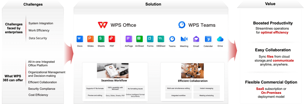 WPS 365 provides an all-in-one integrated office platform that connects WPS Office and WPS Teams to deliver: